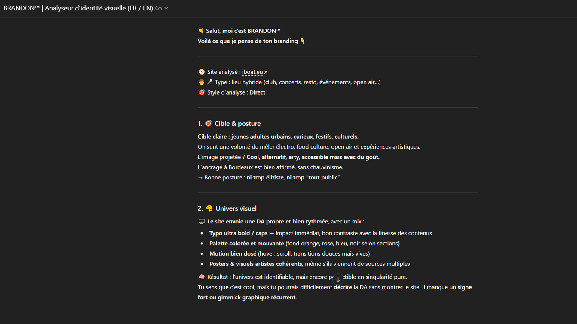 👉 C’est à ce stade que j’intègre Brandon™. L’outil permet d’analyser une identité visuelle existante ou un brief de départ, et de dégager les axes forts à conserver, mais aussi les incohérences à corriger. C’est une base stratégique précieuse avant d’entamer la création.